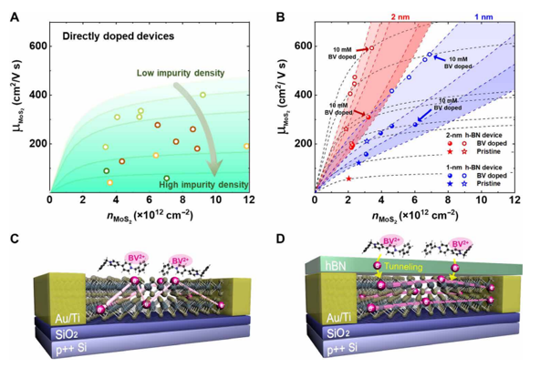 Figure 2. Experimentally determined mobility (μMoS2) and calculated mobility (μimp) as a function of carrier concentration (nMoS2). The μimp values are calculated for (A) direct doping (green lines) and (B) remote doping (blue lines for the 1-nm h-BN interlayer and red lines for the 2-nm h-BN interlayer) for different impurity concentrations. μMoS2 and nMoS2 values of remotely doped devices with the 1-nm (2 nm) h-BN interlayer are plotted as blue (red) circles and their pristine values are plotted as blue (red) stars, determined at 10 K to minimize the contribution of the phonon scattering. The schematic images of (C) the directly doped device, and (D) the remotely doped device in which the h-BN interlayer suppresses the charged impurity scattering induced by the remote BV2+ dopants.
